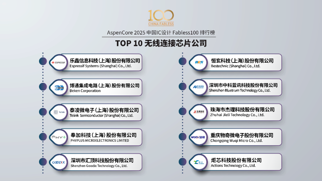 作為中國IC設計行業(yè)的風向標,中國IC設計Fabless100排行榜聚焦綜合實力強和具有高增長潛力的Fabless公司。物奇作為國內領先的短距通信系統(tǒng)級芯片設計公司,長期深耕底層連接技術領域,憑借領先的技術優(yōu)勢和不斷增長的業(yè)績表現(xiàn),連續(xù)三年入選中國IC設計Fabless 100排行榜之Top10無線連接公司,彰顯了公司在中國半導體產業(yè)鏈上影響力持續(xù)穩(wěn)固。