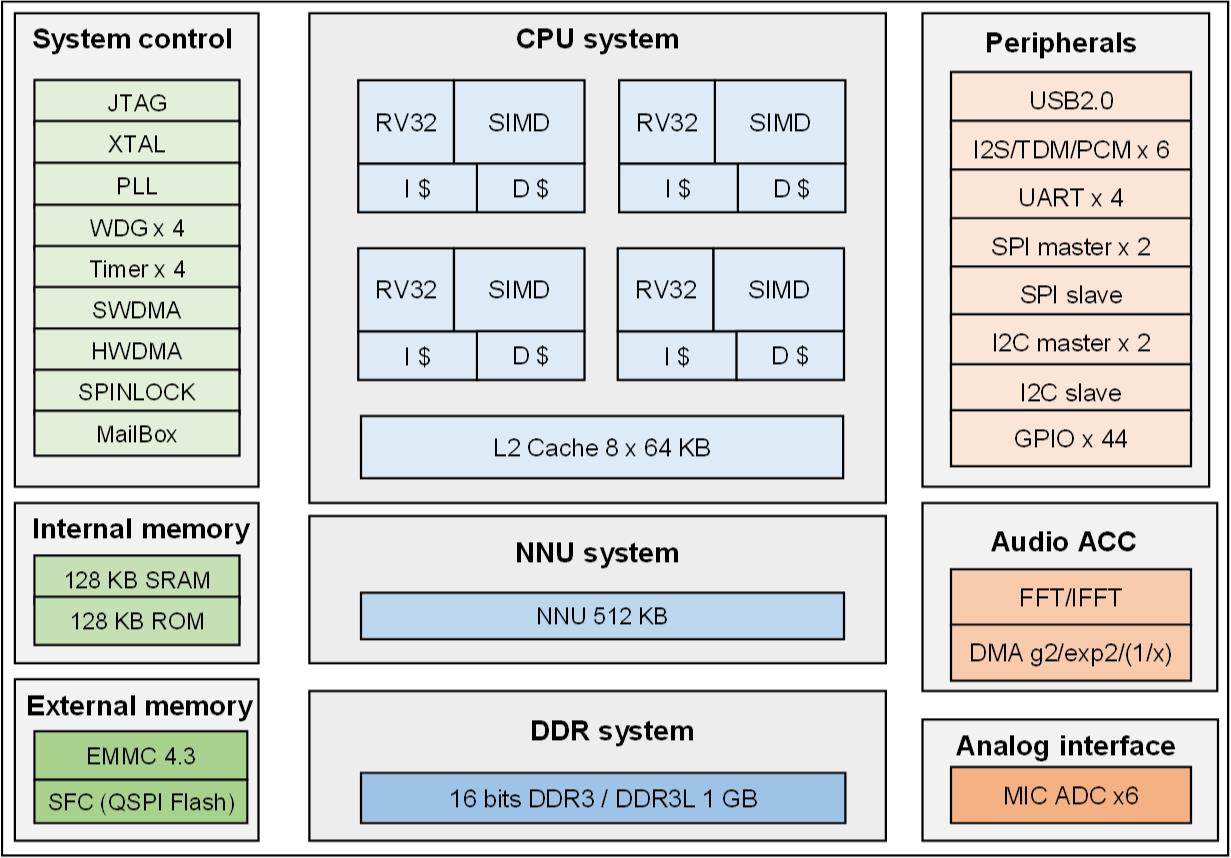 Provides various voice interfaces, and supports analog MIC, I2S, and TDM used for voice inputting