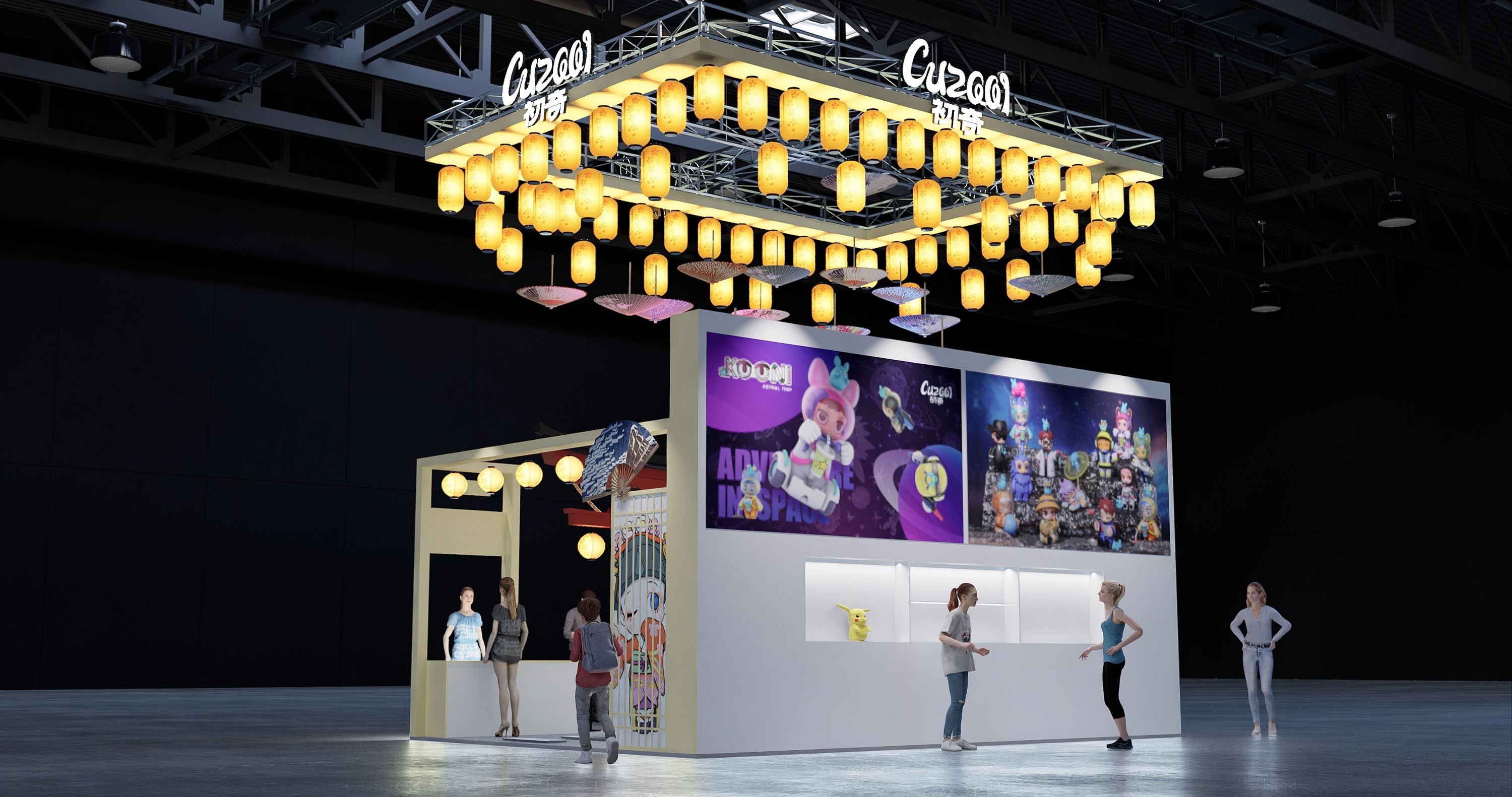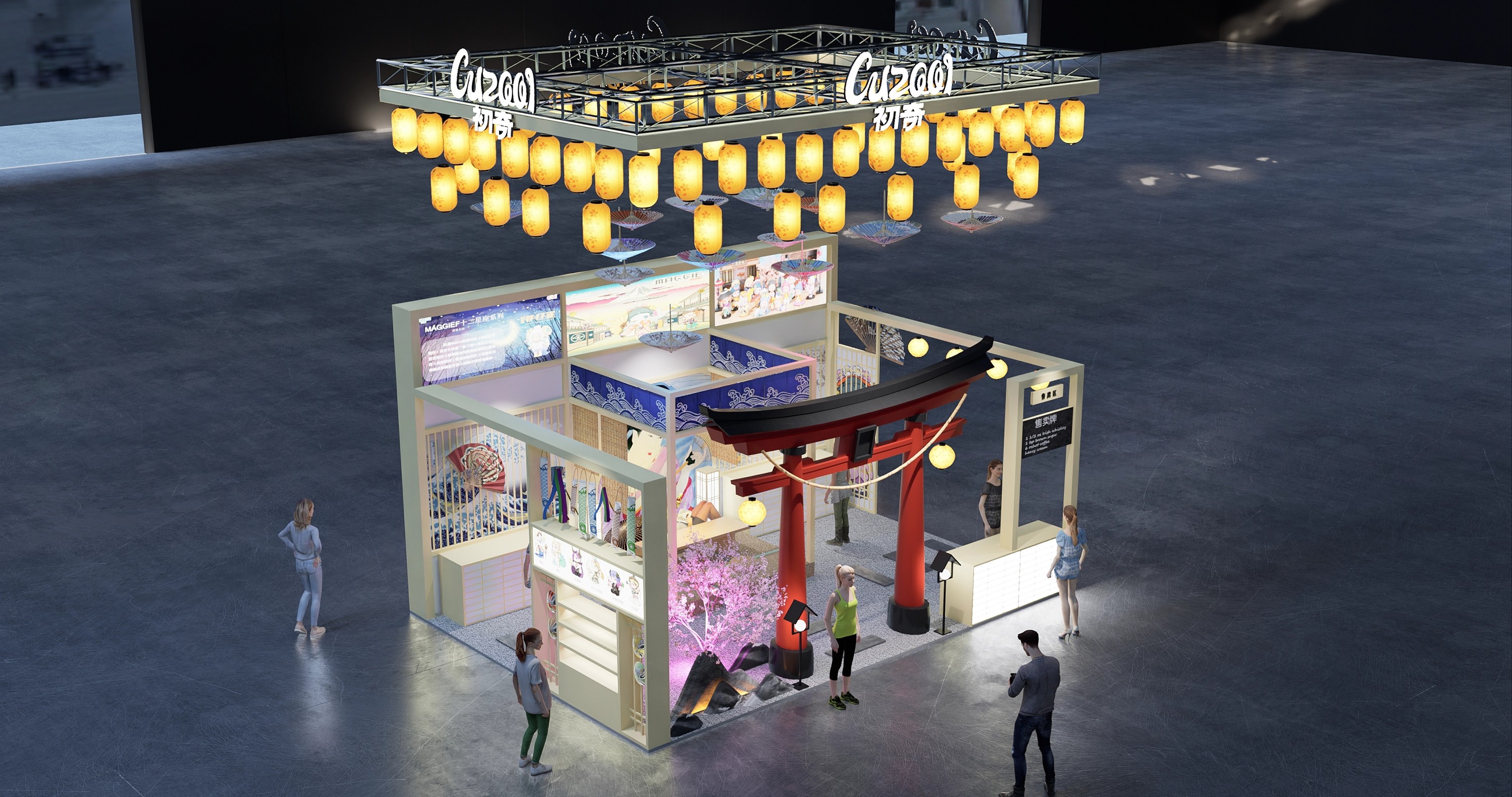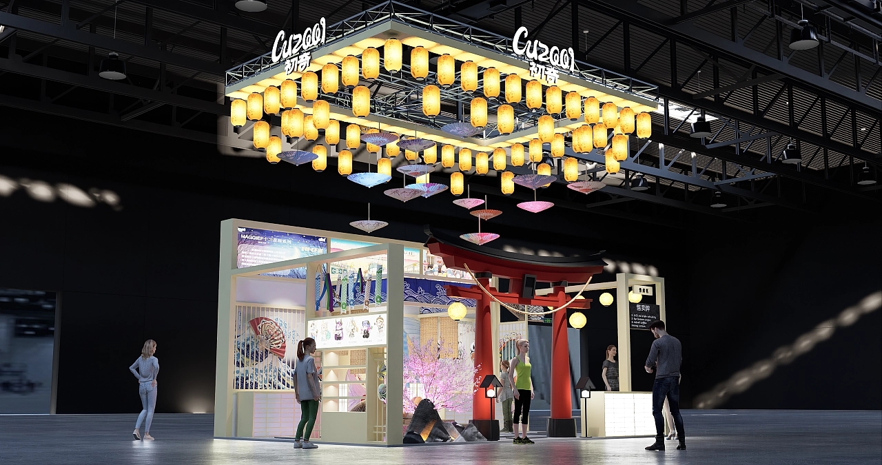 展臺設計搭建面積為56平方米,展臺設計風格使用了日式和風,在展位搭建上方懸掛了日式燈籠和傘,展臺前方搭建了一個鳥居,讓展會觀眾仿佛來到動漫中的廟會當中。背面還布置了兩個大型海報以及三個展示櫥窗,使得來往的參展觀眾能被海報內容所吸引。