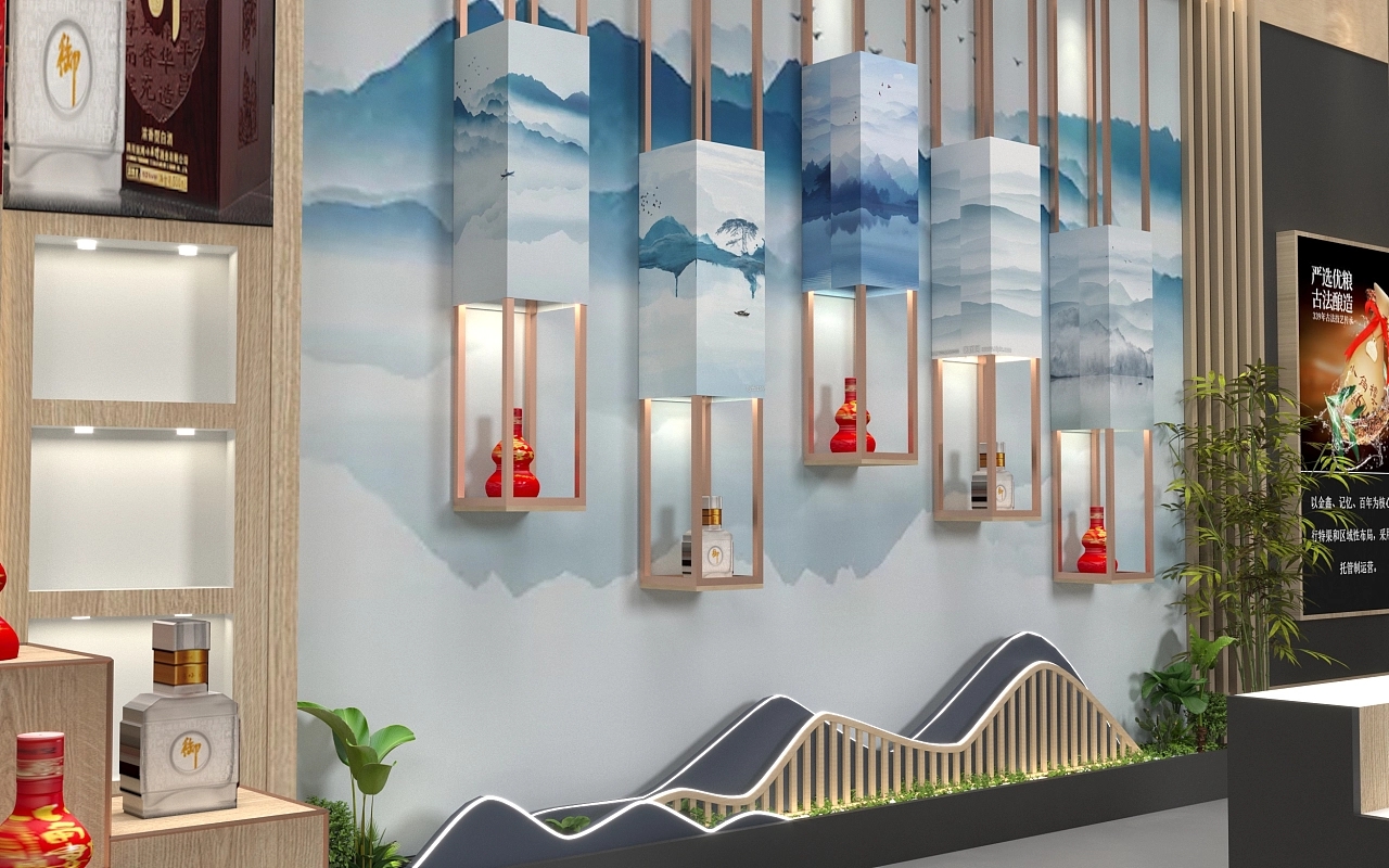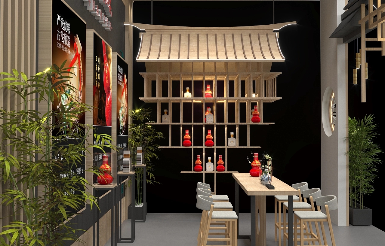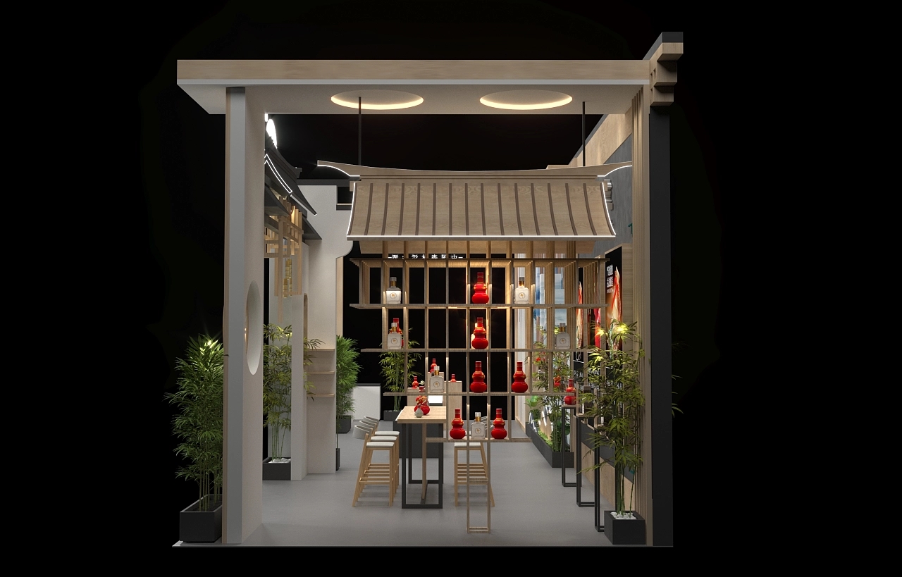 該展臺設計采用了中式的設計風格,在展臺搭建上使用了木質結構框架,造型上除了木質背景,還選用了中式灰墻白瓦,搭配綠色的竹子,打造了一個中式設計風格的展臺。客戶洽談區內布置搭建了燈箱海報,對產品進行宣傳,有利于促進與客戶的合作,提高產品訂單的成交量。